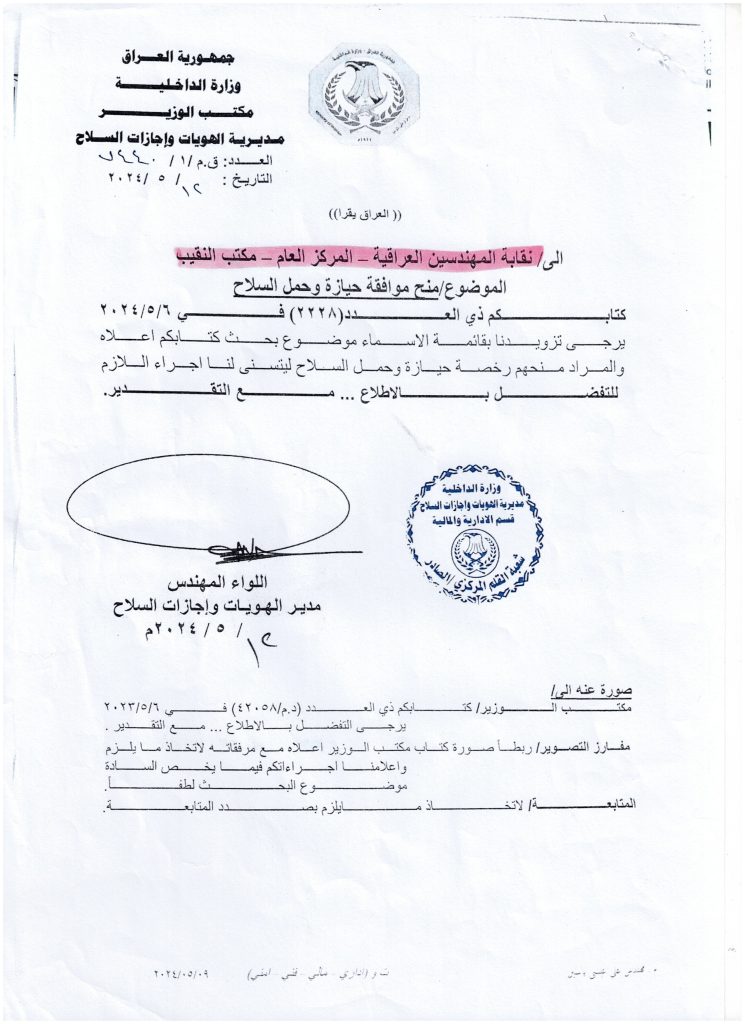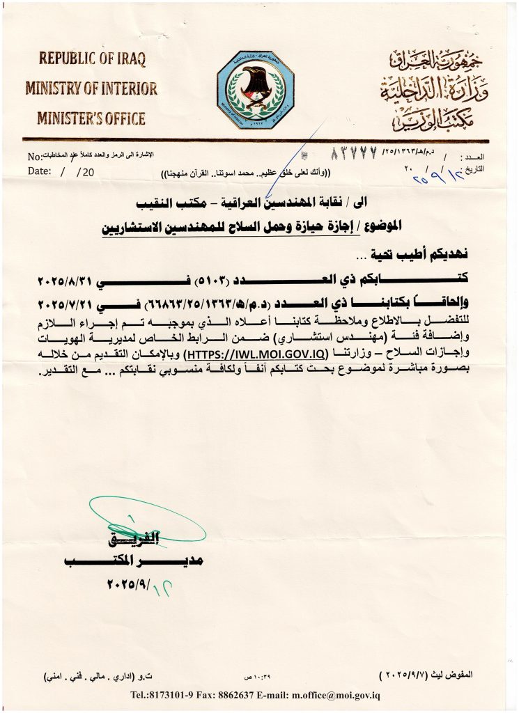 في خطوة هامة تُعزّز أمن المهندسين وتؤكد مكانتهم المهنية، أعلنت نقابة المهندسين العراقية عن استجابة وزارة الداخلية لطلبها بالموافقة على إصدار إجازات حيازة وحمل السـ.ـلاح للمهندسين من هم بدرجة استشاري.