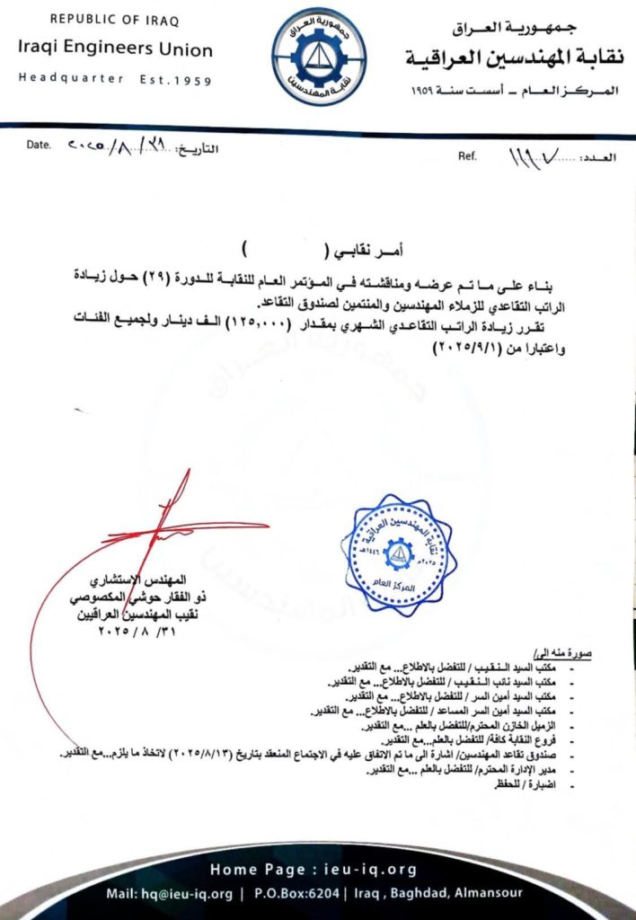 ويأتي هذا القرار انسجاماً مع رؤية النقابة في تعزيز مكانة المهندس العراقي، وضمان حياة كريمة لزملائنا الذين أفنوا أعمارهم في خدمة المشاريع الوطنية وتطويرها، حيث سيتم العمل بهذه الزيادة اعتباراً من شهر أيلول الحالي.