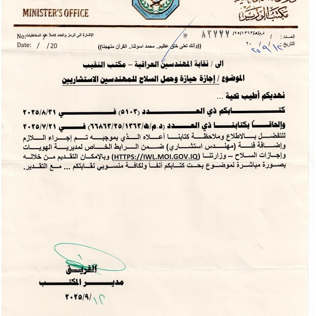 2025-10-10 نقابة المهندسين: الداخلية توافق على منح إجازات حيازة وحمل السـ.ـلاح للمهندسين من هم بدرجة استشاري في خطوة هامة تُعزّز أمن المهندسين وتؤكد مكانتهم المهنية، أعلنت نقابة المهندسين العراقية عن استجاب